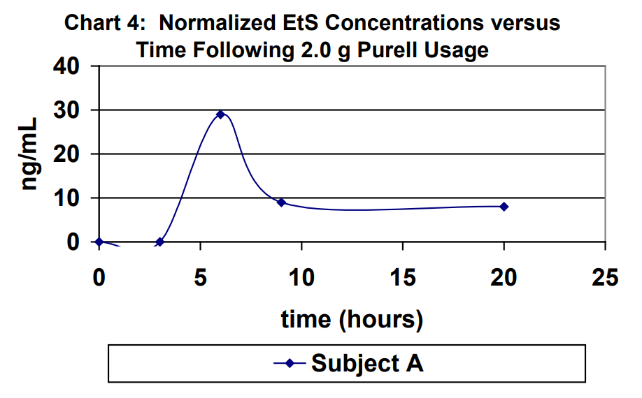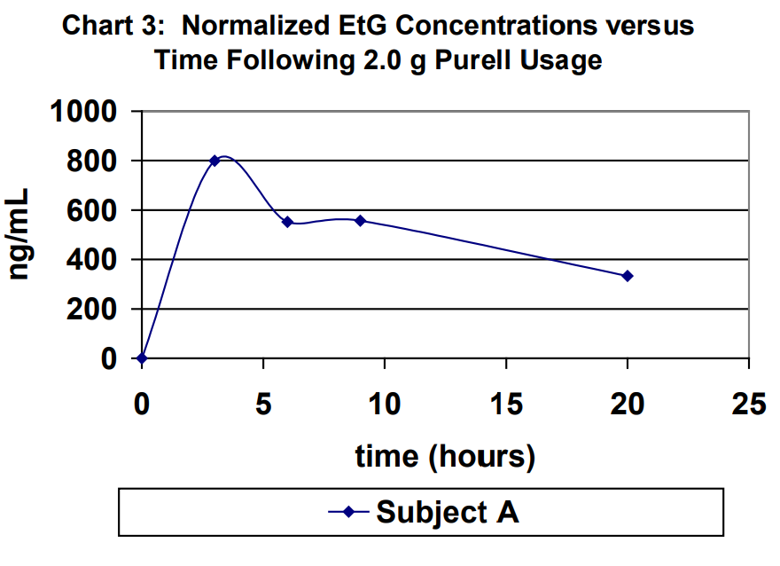 Urine specimens for Subject A were captured at 3 hours, 6 hours, 9 hours and 20 hours (first void next morning) following 2.0 g usage of Purell. The results for the urine specimens are outlined in Table 2. For purposes of comparison, the results were normalized to a creatinine level of 100 mg/dL in Table 1. Normalized EtG results are shown in Chart 3. Normalized EtS results are shown in Chart 4.