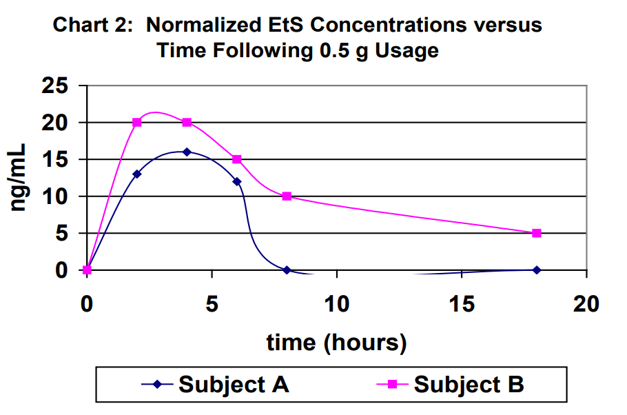 Urine specimens for each subject were captured at 2 hours, 4 hours, 6 hours, 8 hours and 18 hours (first void next morning) following 0.5 g usage of Purell. The results for the urine specimens are outlined in Table 1. For purposes of comparison, the results were normalized to a creatinine level of 100 mg/dL in Table 1. Normalized EtG results are shown in Chart 1. Normalized EtS results are shown in Chart 2.